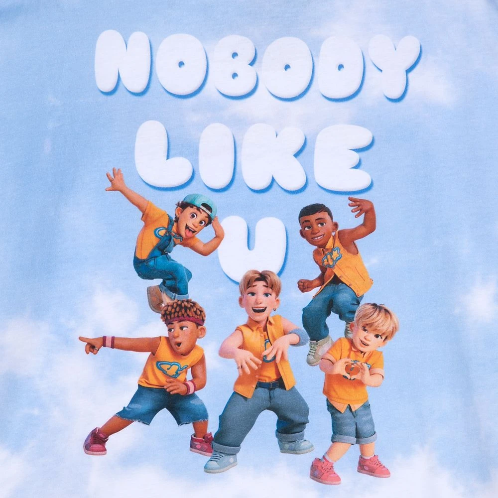 Mei’s favorite group, the hugely successful boy band 4★Town, strike a pose as they promote their hit single Nobody Like U on this tee. Robaire, Aaron T., Aaron Z., Tae Young and Jesse are pictured on the back of this shirt inspired by Disney and Pixar’s Turning Red.