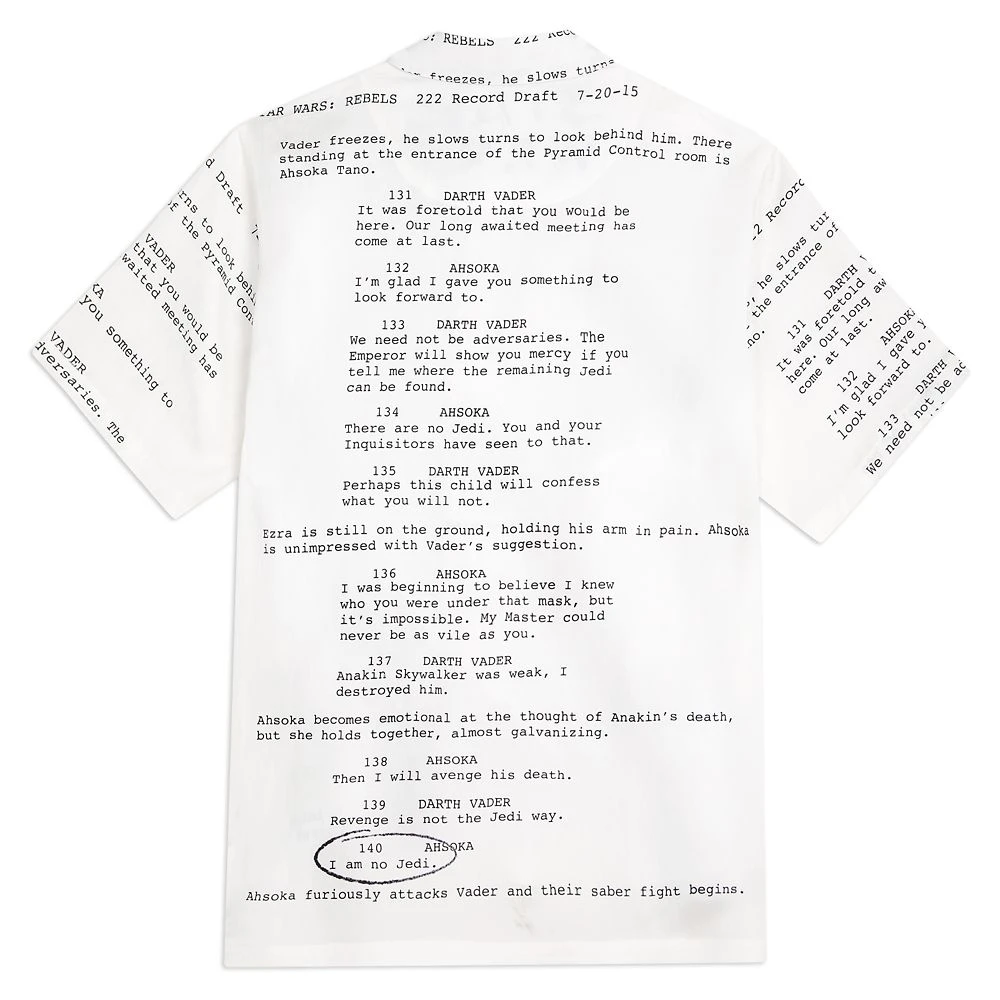 You won’t be so much a script writer as a script wearer when donning this woven shirt. The novel design reprints pages from a script of Star Wars Rebels featuring an exchange between Ahsoka Tano and Darth Vader. The button down shirt was designed for Star Wars by Ashley Eckstein who voiced Ahsoka in such shows as Star Wars Rebels and Star Wars: The Clone Wars.
