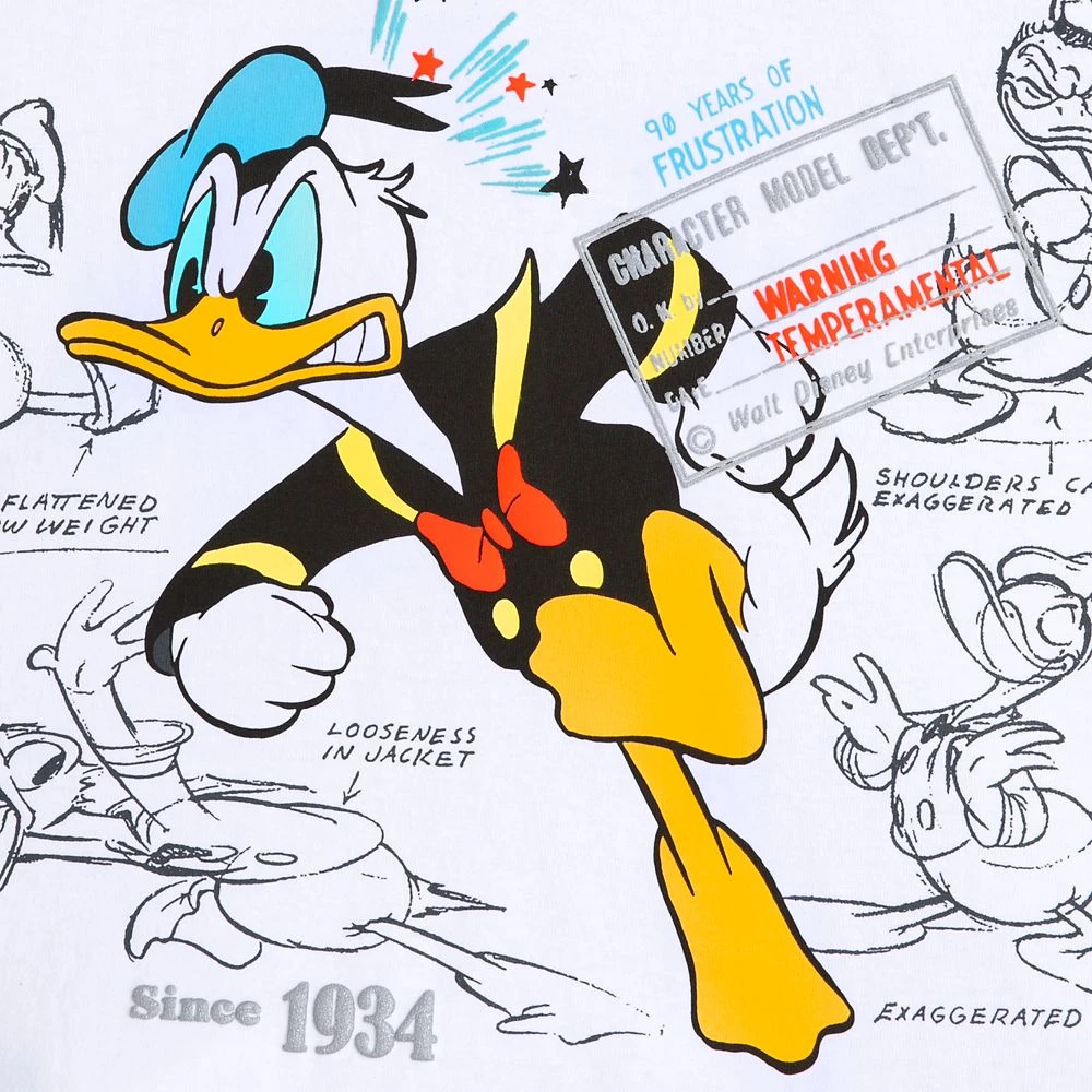 Celebrate 90 years of frustration and ruffled feathers in this commemorative Spirit Jersey honoring longtime cartoon favorite Donald Duck on his nine decade anniversary. Puffy accents and vintage Disney Studios art display Donald through the years on front, back and sleeve.