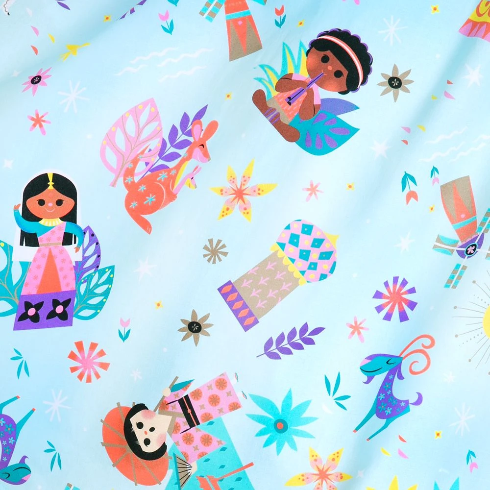 Go for a spin around the globe when wearing this dress inspired by Disney it’s a small world. Characters and landmarks from the popular Parks attraction are featured in the allover print on this colorful A-line dress. A fitted bodice, pleated skirt and puff sleeves make this chic cotton dress one that will make a big impression on a small world.