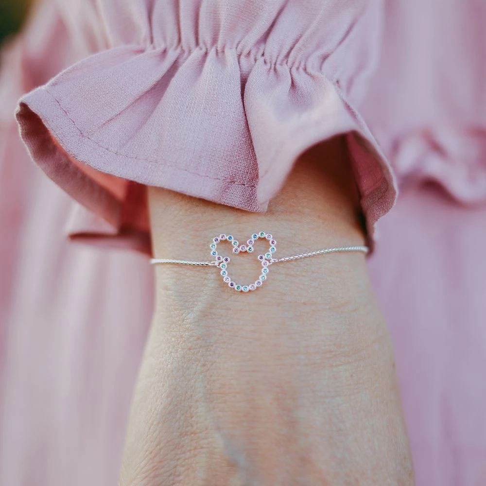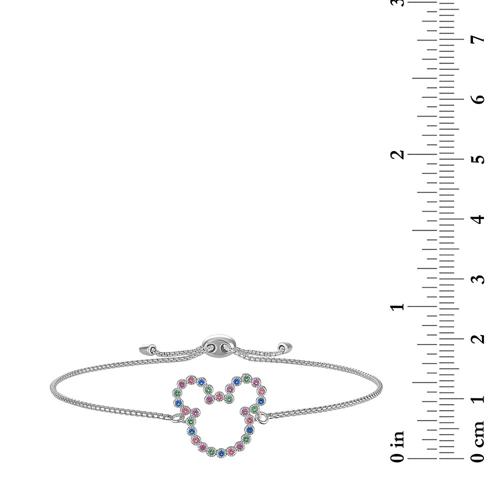 Every sparkle is worth a thousand smiles with this Mickey Mouse icon bracelet by Rebecca Hook. Beautifully crafted in sterling silver, the bolo-style bracelet features blue, green, pink, and purple nano gems. Adjustable to assure a perfect fit, it makes a wonderful gift for someone you love or a special treat for yourself.Â