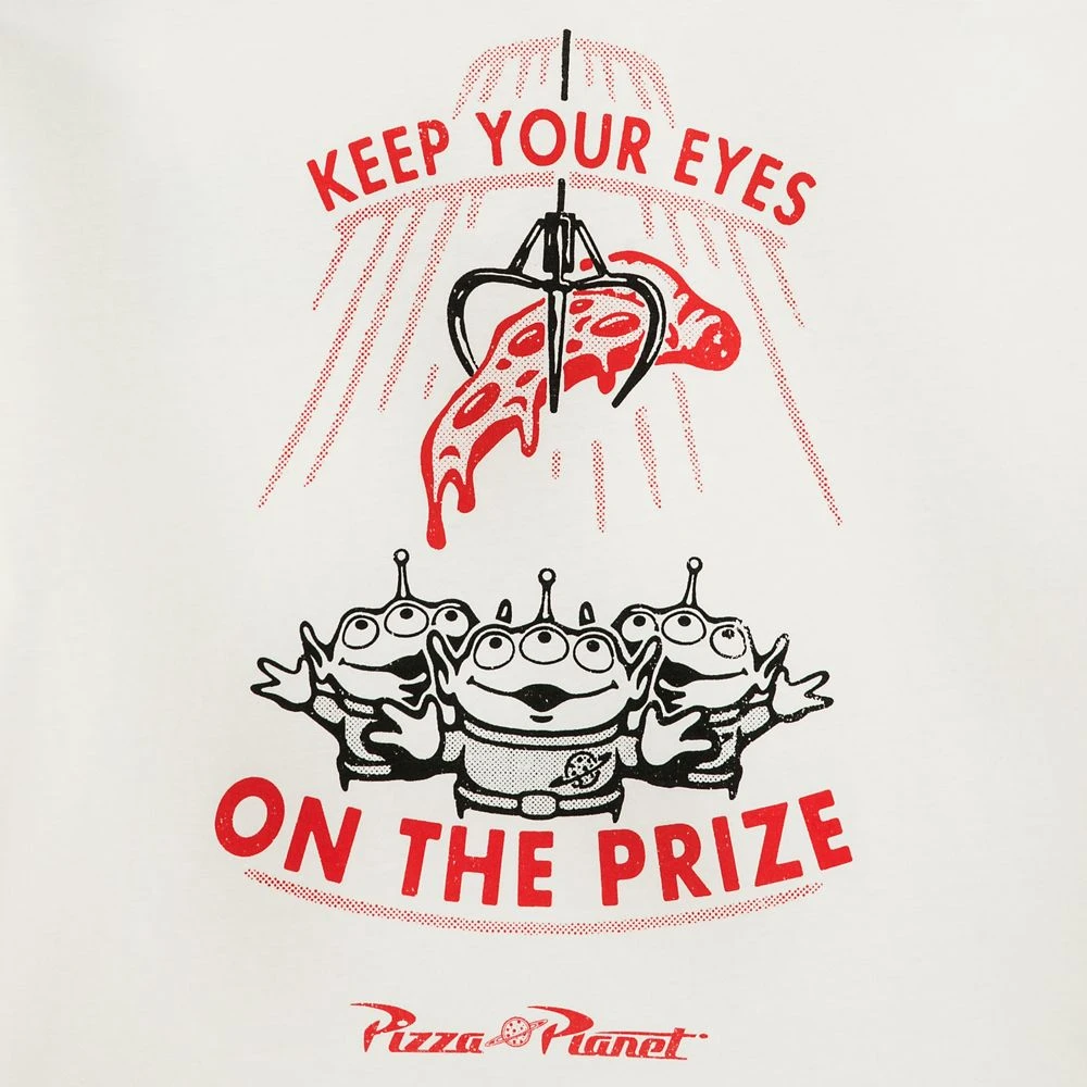 - Pizza Planet logo and ”Keep your eyes on the prize” text on back