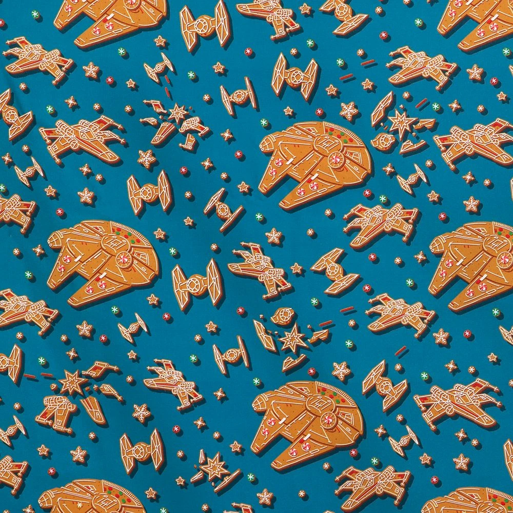 - Allover pattern features holiday cookie versions of the Millennium Falcon, X-Wing, TIE Fighters, stars, sprinkles and blasts