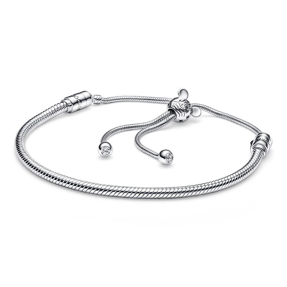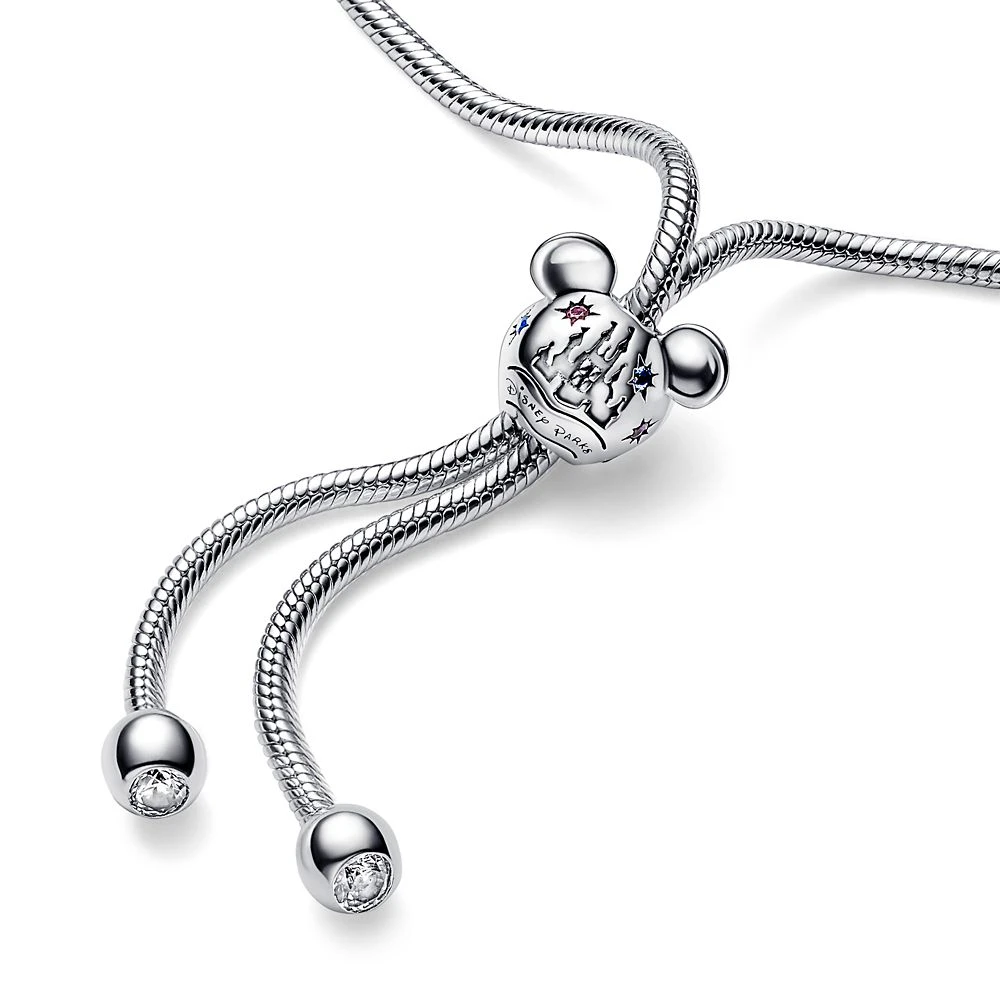 Keep memories of your trips to the Disney Parks on hand at all times when wearing this Fantasyland Castle slider bracelet by Pandora Jewelry. Hand-finished in sterling silver, this piece features a sliding clasp in the shape of a Mickey icon with round brilliant-cut clear cubic zirconias so it’s always going to be a perfect fit.