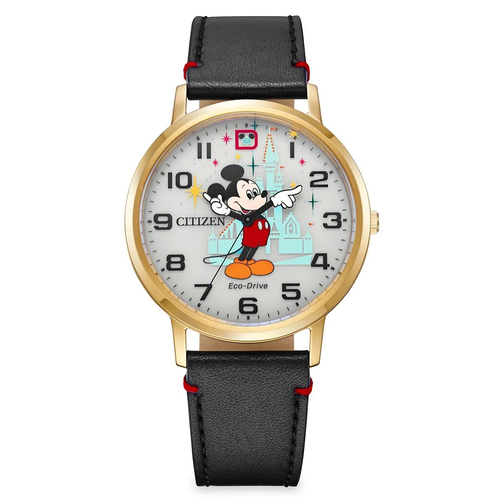 The new Disney x Citizen Walt Disney World 50th Anniversary Vault Timepiece is a unisex watch featuring Mickey Mouse and Cinderella Castle. Perfect for all seasons, style and gender, this watch features a black leather strap, gold-tone stainless steel case and white dial. Mickey’s hands playfully tell the hour and minute as time goes by. Additionally, this timepiece is powered by light, any light, with Citizen’s Eco-Drive technology.