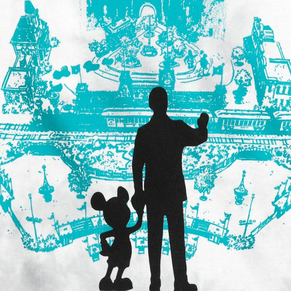The back of this dreamy tie-dye t-shirt recounts Walt Disney’s Disneyland dedication speech from July 17, 1955, alongside a silhouette of the famous ”Partners” statue of Walt with Mickey Mouse. The gothic Disneyland ”D” is proudly displayed on the chest.