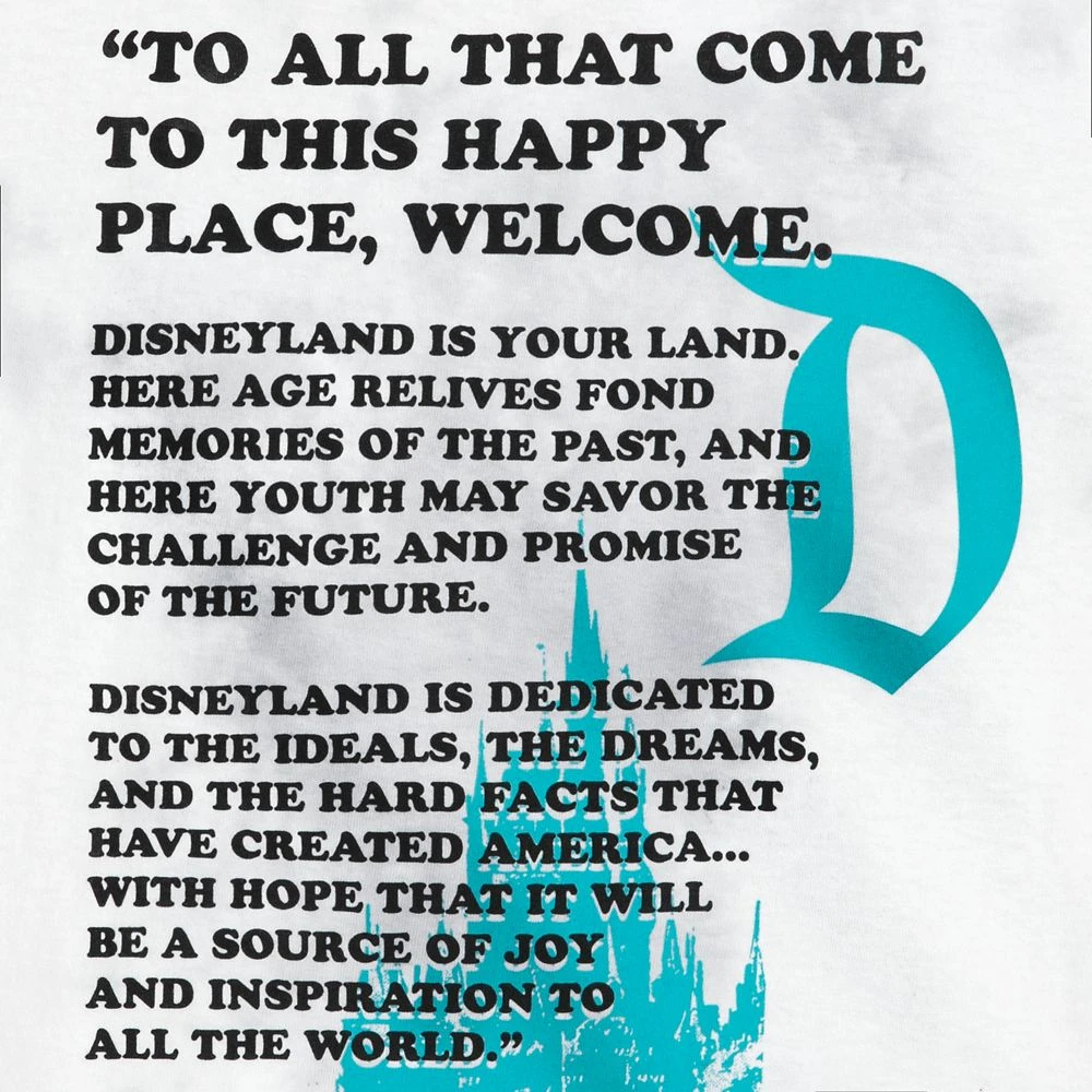 - ”To all that come to this happy place, welcome. Disneyland is your land. Here age relives fond memories of the past, and here youth may savor the challenge and promise of the future. Disneyland is dedicated to the ideals, the dreams, and the hard facts that have created America… with hope that it will be a source of joy and inspiration to all the world.” Walt Disney quote text on back